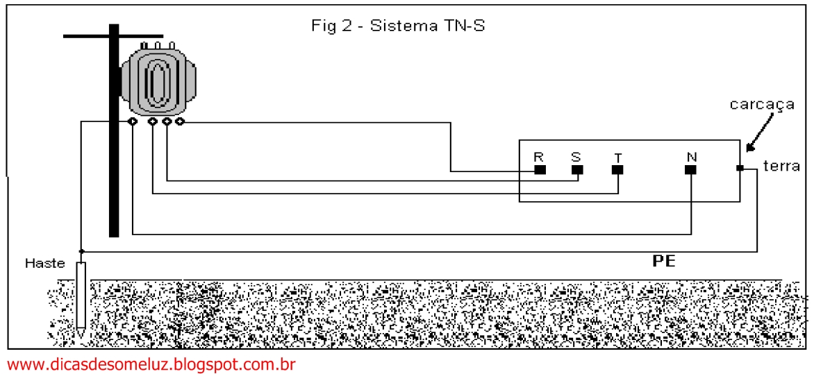 A – Sistema TN-S : Notem pela figura 2 que temos. O neutro é aterrado logo na saída do transformador , e levado até a carga . Paralelamente , outro condutor identificado como PE é utilizado como fio terra , e é conectado à carcaça (massa) do equipamento.