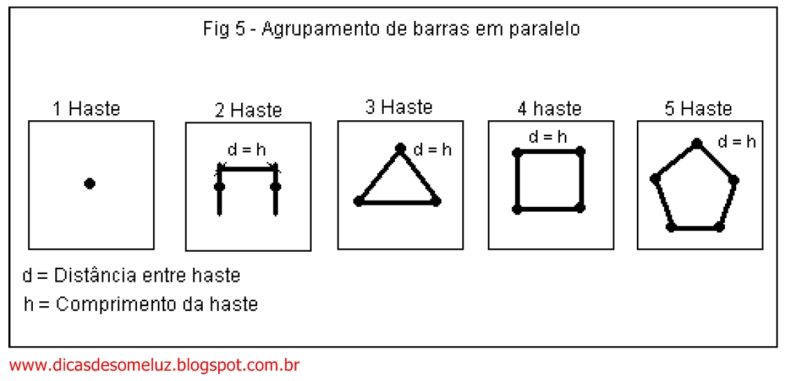 Cabe lembrar que, quanto maior a haste , mais riscos corremos de atingir dutos subterrâneos (telefonia, gás , etc...) na hora da sua instalação. Normalmente , quando não conseguimos uma boa resistência de terra (abaixo de 10W) , agrupamos mais de uma barra em paralelo (veja Fig 5). Quanto à haste , podemos encontrar no mercado dois tipos básicos :