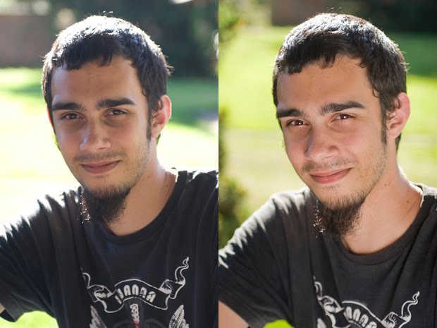 Você tambem pode ver aí um exemplo de imagem chapada, com o rosto do rapas se fundindo na iagem, sem contraste e iluminação decente, e depois o rosto dele é iluminado com luz rebatida.