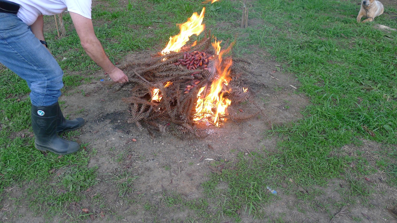 Junte galhos secos de pinheiro, ponha os pinhões no meio, ponha fogo.