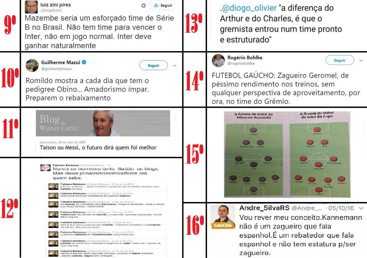 Um torcedor gremista fez a Copa do Mundo das notícias contra o Grêmio, com votação pelo Twitter, rodada a rodada. A gente debocha muito da RBS (filial da Globo) ser colorado, olhem que comédia a classificação final: