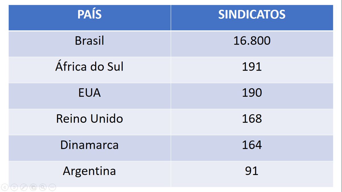 O Brasil é onde existe o maior número de sindicatos do mundo. Tem centrais sindicais a torto e à direita e aí vale uma crítica. Nós trababalhadores achamos que nossa contribuição serviria a esse propósito, mas foi sempre desviado para fins políticos/partidários, para no fim se transformar nas pautas... nas famigeradas pautas.