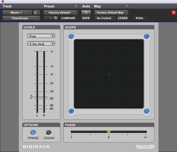 Pega qualquer plugin na sua DAW que faça isso. No Logic é o Multimeter, por exemplo, mas todos tem uma cara parecida. Essa barra azul/vermelha (correlation) te aponta problemas de fase automaticamente quando seus ouvidos podem te trair. ;-)