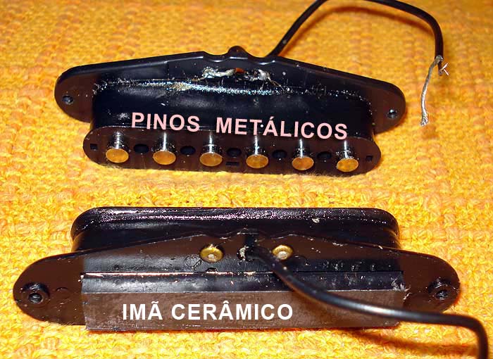 Devido a minha G.A.S,tinha aqui em casa uns 12 captadores singles cerâmicos retirados de guitarras baratas que eu customizei com captadores melhores. Pois bem, prá não jogá-los fora, resolvi dar um upgrade neles prá alnico e deixá-los pelo menos com uma certa dignidade (usáveis, portanto...). Por questão de economia, os single cerâmicos, em vez de pinos individuais de imã alnico (liga magnetizada de alumíno/níquel/cobalto + ferro), apresentam pinos metálicos que conduzem o magnetismo de um grande imã retangular do tipo cerâmico/ferrite colocado na base do captador: http://2.bp.blogspot.com/_EhllPl-8U-I/S-IybwE21UI/AAAAAAAAAD4/7UuqQnQy zv0/s1600/ceralnico_01B.jpg Essa configuração gera um campo magnético totalmente diferente do gerado pelos pinos de alnico, por isso a diferença (prá pior) de sonoridade dos captadores cerâmicos. O resto da estrutura é basicamente a mesma de um single alnico genérico: fios/enrolamento, carretel da bobina, ligações, etc. Então, a idéia aí e tirar o imã cerâmico e os pinos metálicos e colocar pinos de alnico.