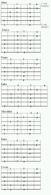 notas: Dó_Ré_Mí_Fá_Sol_Lá_Sí C__D__E._F _G__A _B São as mesmas notas, só que dispostas numa sequência diferente ! Os modos gregos são nada mais nada menos do que a reprodução de shapes (modos) de escalas em toda a extensão do braço da guitarra, pois cada modo terá a sua nota tônica (nota inicial) como uma nota diferente, mas é a mesma escala, as mesmas notas, só que em ordem diferente, pois a tônica (nota que vc começa a escala) é diferente... Pra facilitar um pouco: O modo Jônio na minha opinião é o mais importante pra quem ta começando a aprender os modos gregos na guitarra, pois é a tônica da escala maior, basta vc ter a escala menor, avançar um tom e meio (três casas) que vc já tem três escalas a mais pra solar: escala maior, escala maior pentatônica, e escala de Jônio, tudo iniciado na mesma nota, é a mesma tônica...