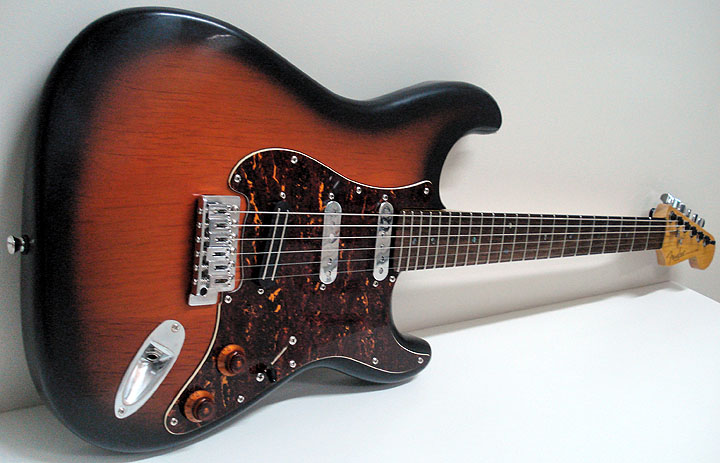 Carreguei 2 fotos. Uma da SX SST57 e uma da Les Paul (o formato da do amigo é essa mesmo) e perguntei qual ele achou mais bonita e que um dia gostaria de ter. Ganhou a strato. A foto era de uma sunburst com escudo "marrom" (parece o que chamavam de casco de tartaruga. Eu e meu amadorismo...rs). Essa aqui, que foi "tunada" pelo dono: