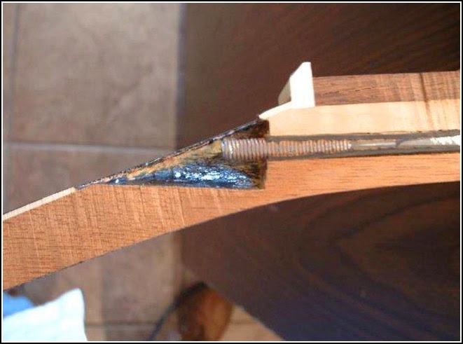 Um dos outros motivo das LP serem fraca e a pouca quantidade de madeira numa area do headstock, esta foto mostra isso