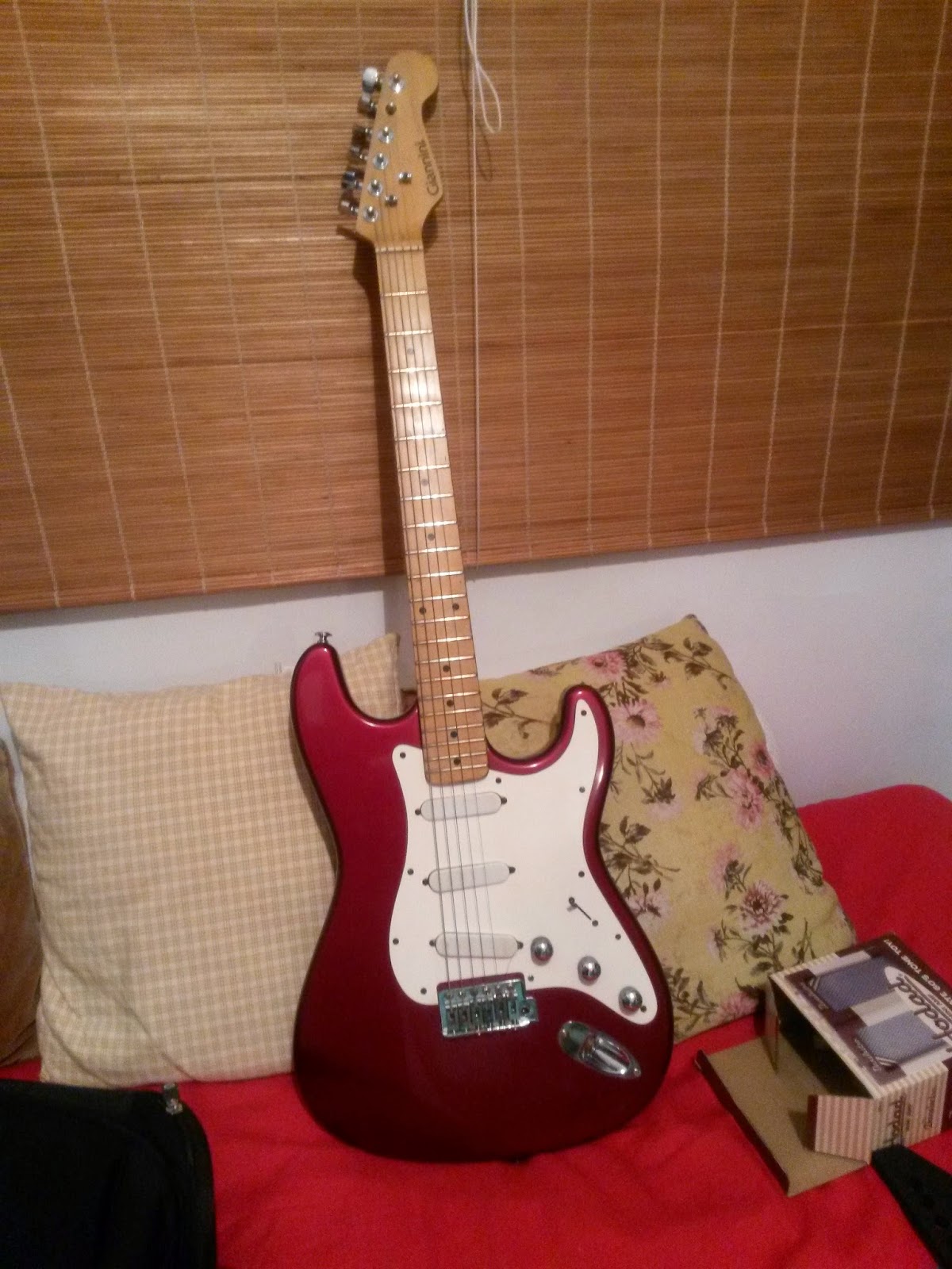 Bom galera, semana passada peguei essa Strato numa troca. É uma Giannini Stratosonic do período pré southern cross, pesquisei bastante por ai e creio que ela seja de 91-92. Ela estava com o escudo original, chave de 3 posições e aqueles captadores lisos. Porem o escudo tava quebrado e a eletrica estava bem ruim, como eu tinha uma strato velha aqui que so servia de enfeite, (tava bonita, ai deixava pendurada na parede uahuahu) o escudo dela tava aquele Branco/Bege ja por causa do tempo, envelhecimento natural, bem bonito, resolvi colocar junto com os captadores (ja que os originais nao sao grande coisa e esses tambem nao) e a eletrica toda feita.