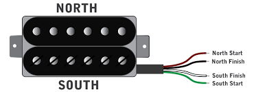 Vamos chamar uma bobina do humbucker de A e a outra de B. Ambas as bobinas possuem polaridades "norte" e "sul".
